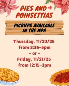 Your Remlinger Farms Pies and Squak Mountain poinsettias will be available for pick up in the SES Multipurpose room on Thursday, November 20 from 3:36-5pm or Friday, November 21 from 12:15-3pm. We also have a few extra pies available for sale. If you missed ordering a pie, email president@sesptsa.com.